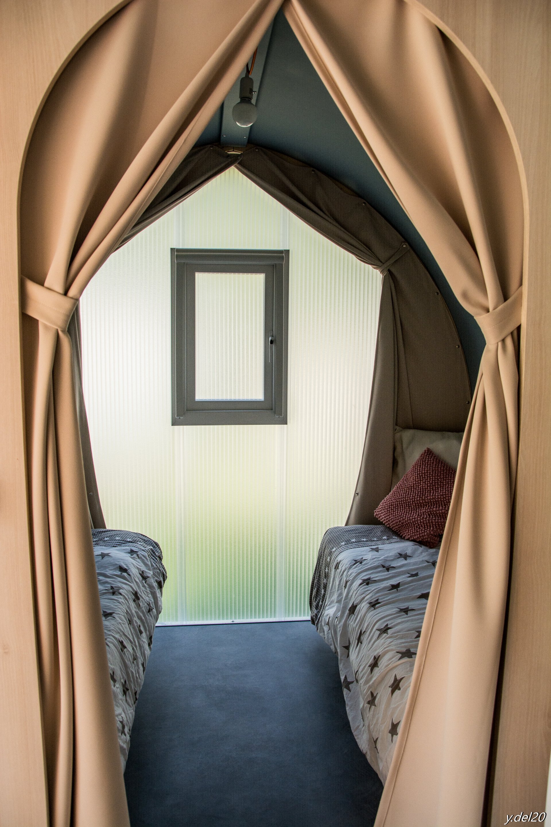 Cet hébergement tendance est à mi-chemin entre une tente et une caravane avec une touche moderne. Le design unique en acier galvanisé avec toile, d'une superficie de 16m², est idéal pour un maximum de quatre personnes (2 adultes + 2 enfants jusqu'à 10 ans).