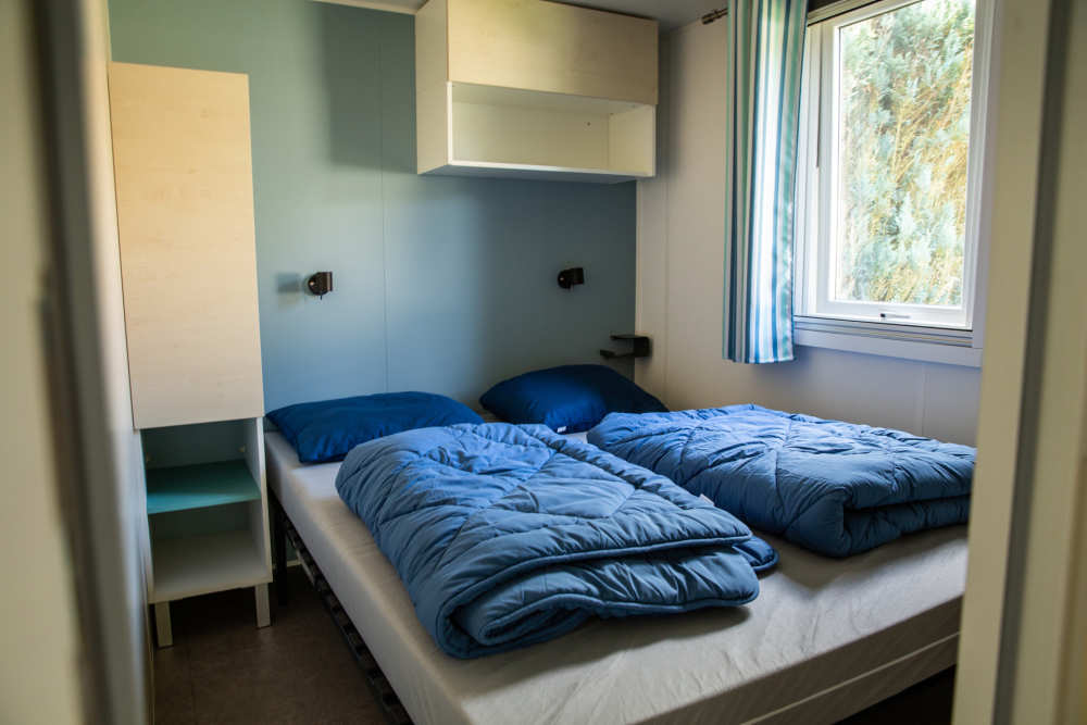 Avec une superficie au sol d'environ 25 mètres carrés et une terrasse à l'avant, l'espace ne manque pas. L'espace de vie du Sun Lodge est orienté vers la terrasse couverte à l'avant, reliée par deux portes-fenêtres, ce qui est très agréable par beau temps. À l'arrière du Sun Lodge, il y a deux cabines de couchage. Dans l'une, il y a deux lits simples et dans l'autre, un lit double. De plus, il y a un canapé-lit dans l'espace de vie. Le Sun Lodge dispose également de ses propres installations sanitaires.