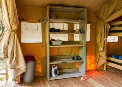 Bij ons hebben we safaritenten voor 4 personen met een privé sanitair unit. Met een vloeroppervlakte van ongeveer 25 vierkante meter en stahoogte in de hele tent, heb je aan ruimte geen gebrek. De voorkant van de tent kan in zijn geheel open, met mooi weer is dit erg prettig. Achter in de tent zijn twee slaapcabines. In één slaapcabine staat één stapelbed en in de andere slaapcabine een tweepersoonsbed (140×200 cm).
